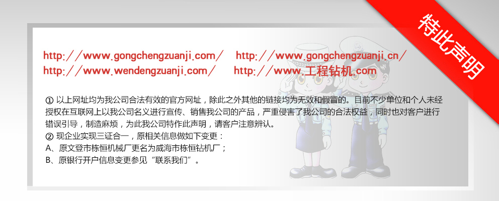 威海市棟恒鉆機廠隸屬于文登市工程鉆機廠,主要生產、銷售工程鉆機。它坐落于文登市西鋪頭工業園,這里科技發(fā)達,交通便利,制造業集中。 自1982年建廠以來,經過多年的優(yōu)化改革和沉淀積累,擁有精密、大型加工設備近百臺的生產企業之一。現在研制成功的GJ-400、GJ-250S、GJ-250A、GJ-240S、GJ-240A、GJ-180S、GJ-180A型等鉆機。在其它產品上,企業建立了長期、中期、短期的發(fā)展規(guī)劃,一系列的高性能產品正在不斷推出中,企業應市場需求對系列產品進行了優(yōu)化組合,開發(fā)了與之對應配套的三腿、四腿單天車輪、雙天車輪鉆塔;泥漿泵—BW-160Q、BW- 200Q型球形閥泥漿泵大大提高了泵的使用性能和機械效率